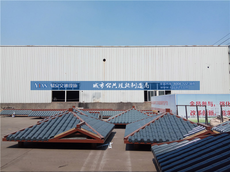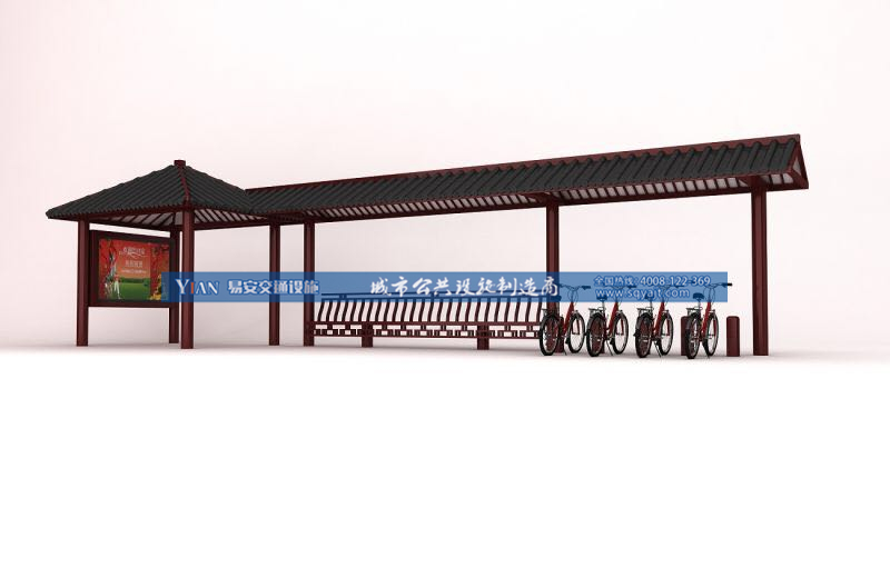 宿 迁景区全新改造了一批仿古自行车亭,古朴典雅的自行车亭与景区的自然景观交相辉映。这些自行车亭的主体框架全部采用优质的镀锌板材管材,其中加入了仿古元素,外面喷涂了深咖啡色的油漆,上方以仿古瓦作为挡雨檐,整体造型非常别致美观。