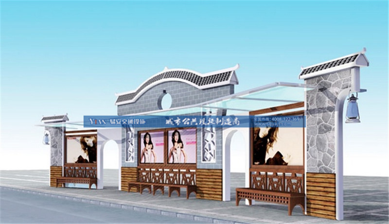在科技充斥着生活的全部,当金属和石块堆满着整个城市,当人们在快节奏的生活中身心疲惫,古典文化就会是一股清泉洗涤着内心的浮躁与焦灼。 因此复古变成了越来越多的国人渴望的精神需求,而公交车作为现代化生活中一个代表性的产物,在便捷了人们的生活之时,也加快了人们的步伐,使人们没有时间停下来好好的欣赏身边的景色,没有精力好好的思考生活中的美好。公交车候车亭是所有公交车临时停靠的港湾,是人们暂停脚步得以休息的场所,不但要能让忙碌的人们得以休息身体上的疲惫,得以遮挡烈日的酷晒,得以遮蔽风雨的吹打,同时还需要给与人们以精神的舒适。而仿古候车亭会是一个不二的选择。
