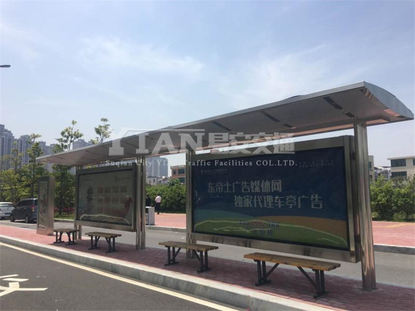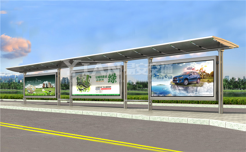 2、顶棚:公交候车亭的顶棚是由很多内部构造组成的,其内部骨架是顶棚重要的组成部分之一,其长度和宽度一般需要根据公交候车亭的大小来进行定制。常见的顶棚材料有:玻璃顶棚、不锈钢顶棚、彩钢顶棚、PC耐力板顶棚、阳光板顶棚、张拉膜顶棚、艺术顶棚。玻璃顶棚、不锈钢顶棚、彩钢顶棚、PC耐力板顶棚、阳光板顶棚、张拉膜顶棚、艺术顶棚。
