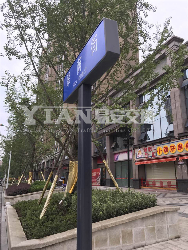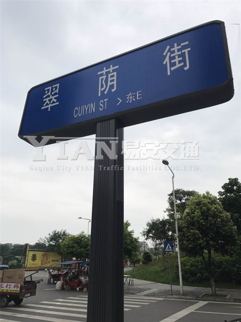 四川南充定制款路名牌 造型简单大方,立柱用铝型材模具 有凹槽造型一体成型。更多定制款式 可来电咨询 宿迁市易安交通设施有限公司。