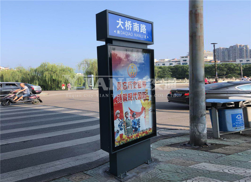 路名牌灯箱,为方便市民出行、导示、辩分方向等,在道路两旁或绿化带上建设的交通设施。由于城市公交的日益发达,路名牌灯箱已发展成为城市一个不可或缺的重要组成部分,设计精美的路名牌灯箱也成为城市一道美丽的风景。一般路名牌灯箱主要由镀锌钢板或不锈钢材料制作,由可视视窗和顶部路牌部分组成,顶部路牌一般多为国家标准色底反光膜,可视视窗即为广告视窗部分,可发布城市资讯、新闻热点、导购等信息,也为投资商带来可观的广告经济效益,成为道路广告投入的首选。